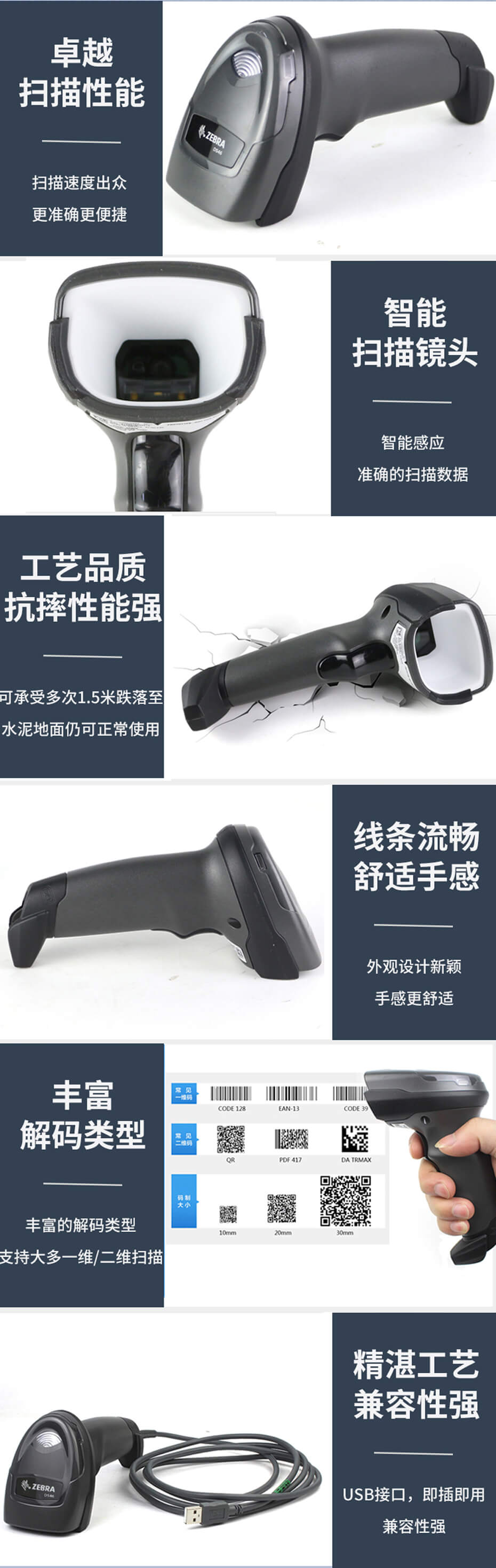 智能掃描 自動感應 強大功能 微型條碼 斑馬DS4600擁有強大的掃描功能,可以精確掃描所有3mm所有的微型條碼,這是其他掃描槍難達到的優勢!即使面對各種不同材質激光雕刻條形碼和手機、計算機屏幕中的條碼,也可以實現簡單快速的一次性成功掃描,設計可靠,經久耐用。