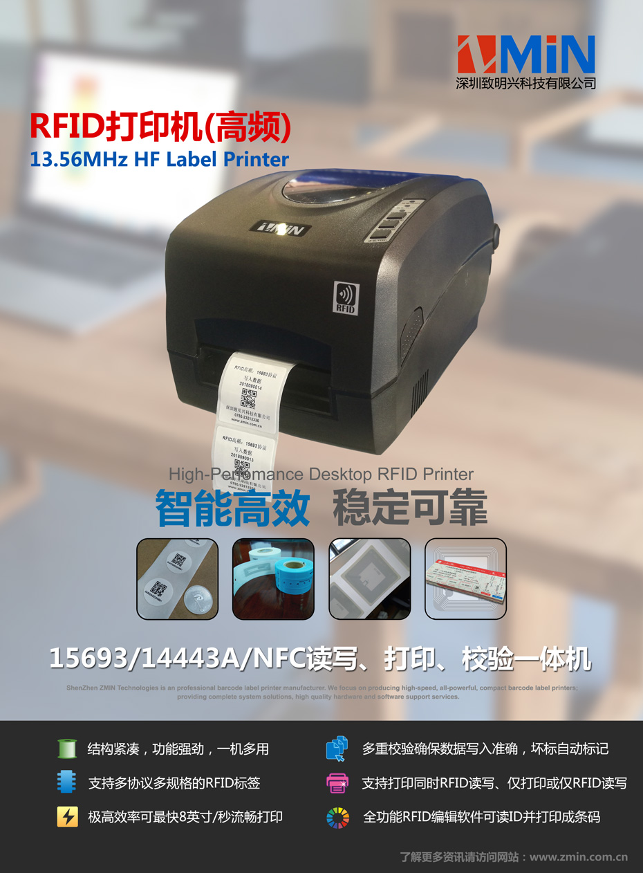ZMIN RFID高頻條碼標簽打印機,支持熱敏或熱轉印模式,讀碼、寫碼、打印功能三合一,擁有防誤讀、誤寫、重讀、重寫,壞標自動打印標記等功能。